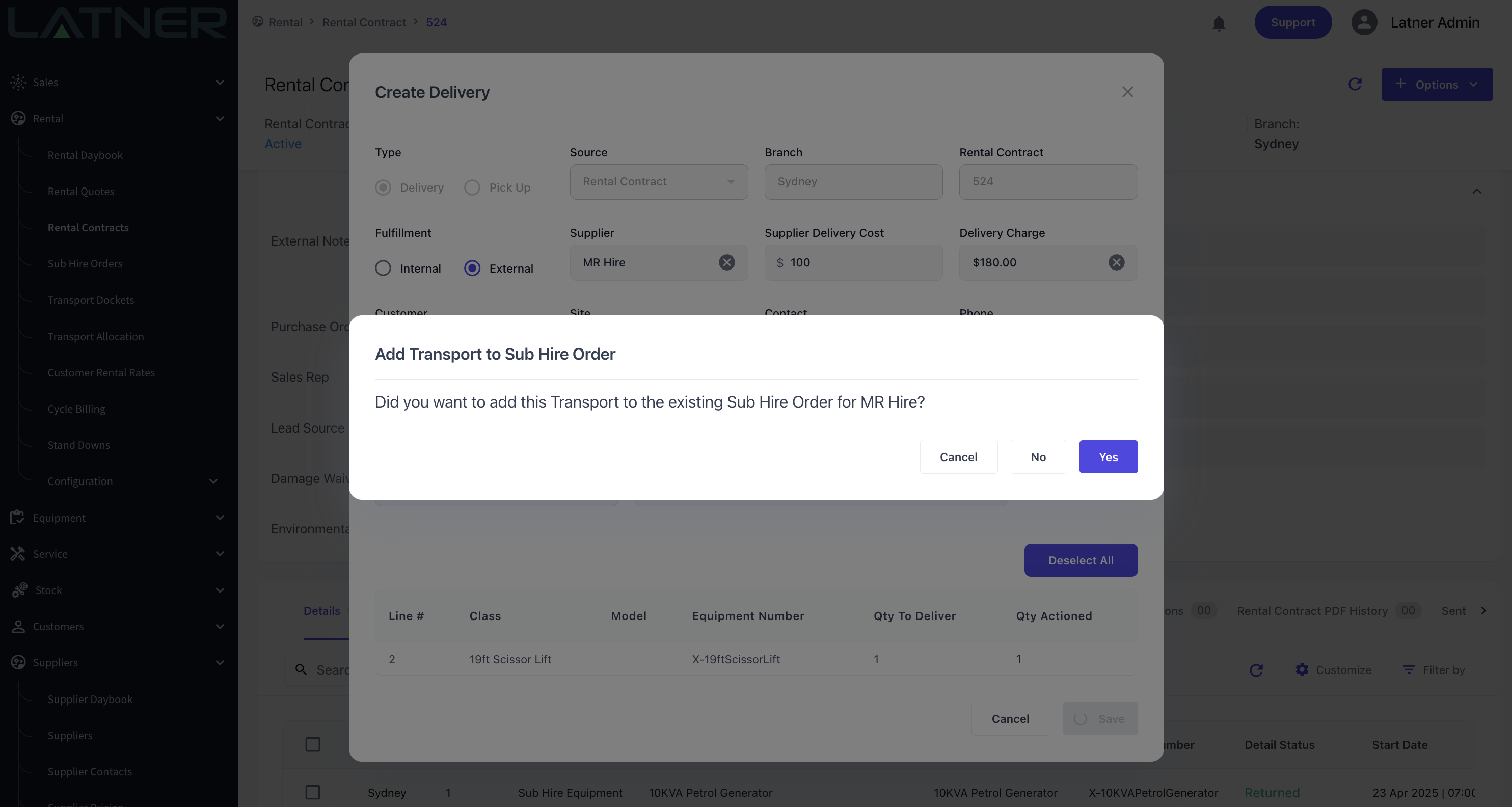 External Transport PO lines can now be added directly onto a Sub Hire Order when creating a Delivery or Pickup for a Sub Hire Equipment Line