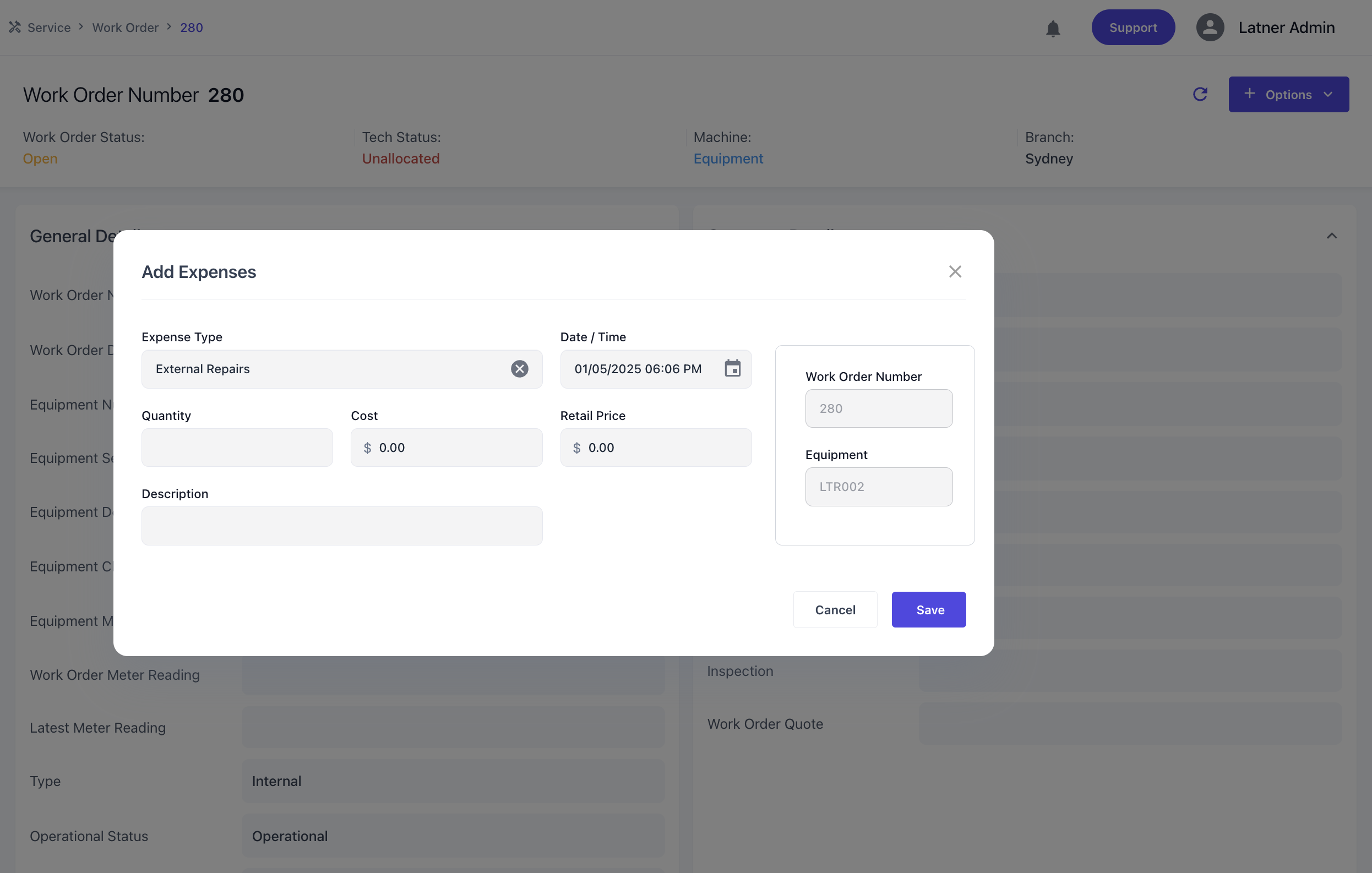 Expense line types can now be added to Work Orders in Latner. This can be done directly or through Purchase Order for External work.