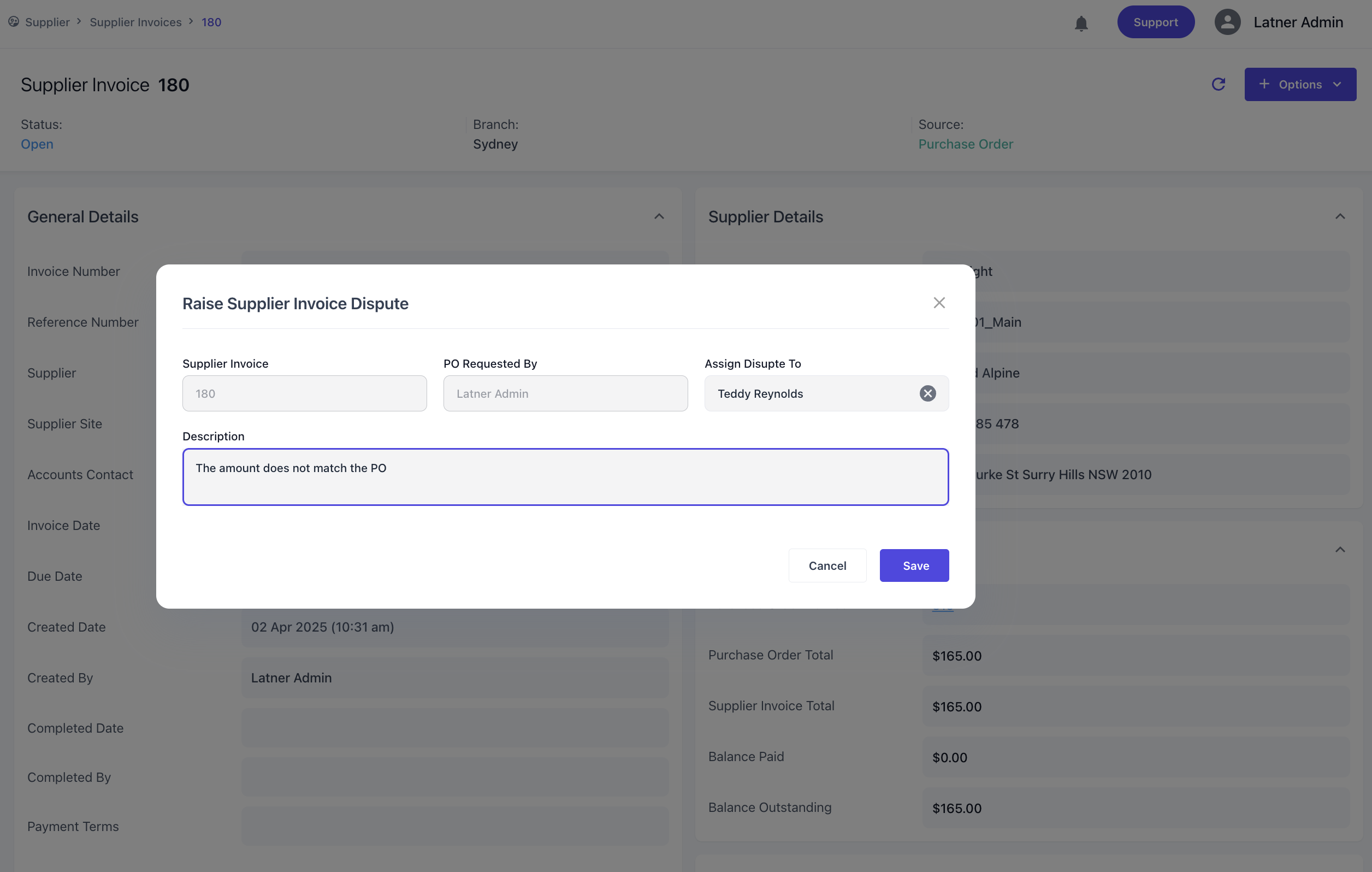 Disputes can now be raised against a Supplier Invoice in Latner. A Disputed Supplier Invoice can be assigned to a user to review. This will generate a Notification to allow the reviewer to investigate and approved the Disputed Supplier Inovice