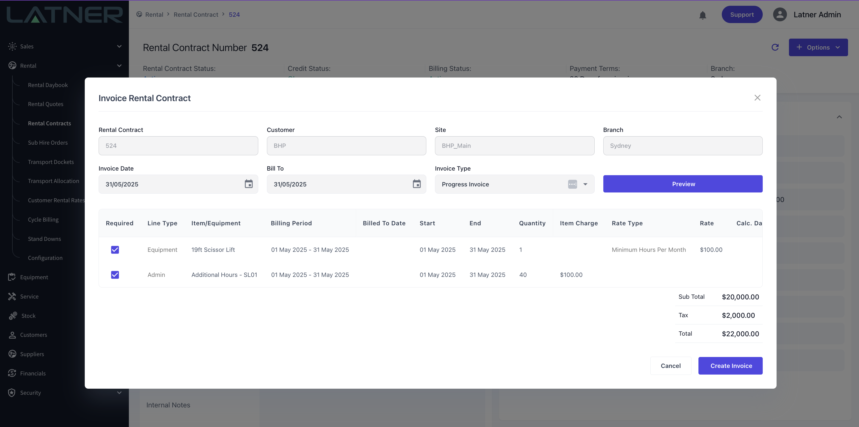 A new Hourly Rate Type ‘Minimum Hours Per Month’ has been added to Latner. This will allow charging for an Equipment based on the number of hours used throughout a single month. Meter readings for the Equipment are used directly to calculate any Additional Hours charged