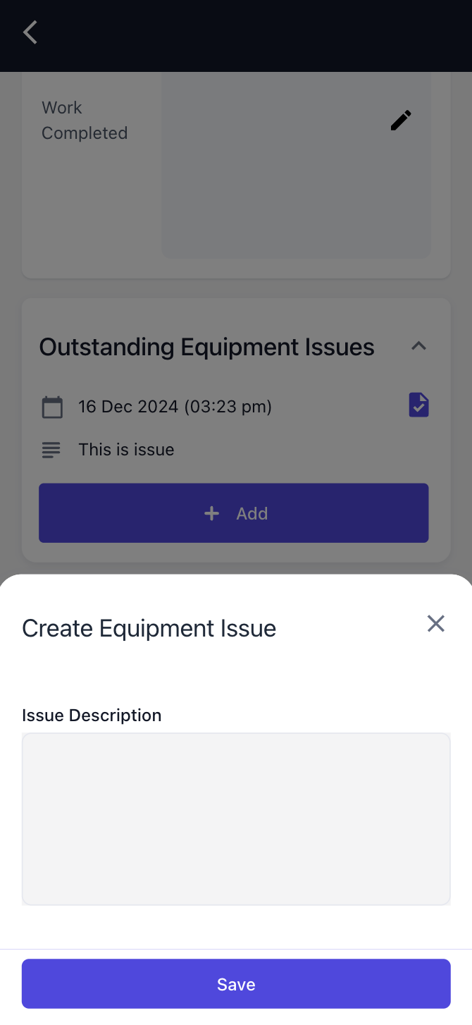 Users can now create outstanding issues for an Equipment from a Work Order. These issues are linked to the Equipment and can be viewed and resolved in future work orders