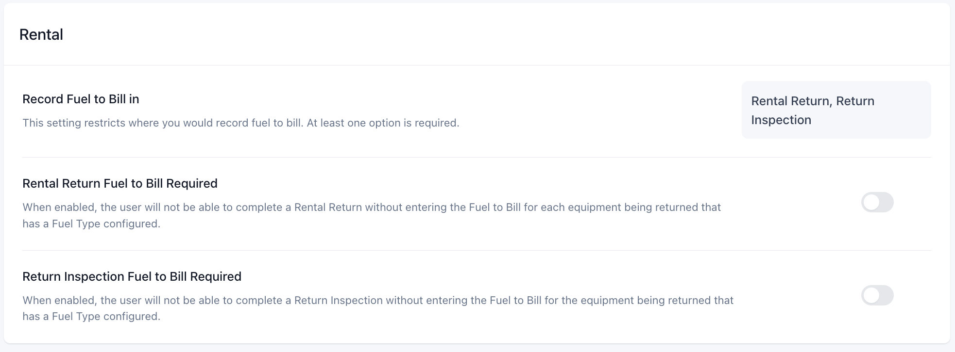 Fuel to Bill settings have been added in to Latner to control at what stage of a contract Fuel is entered. This setting can be found under Rental Settings