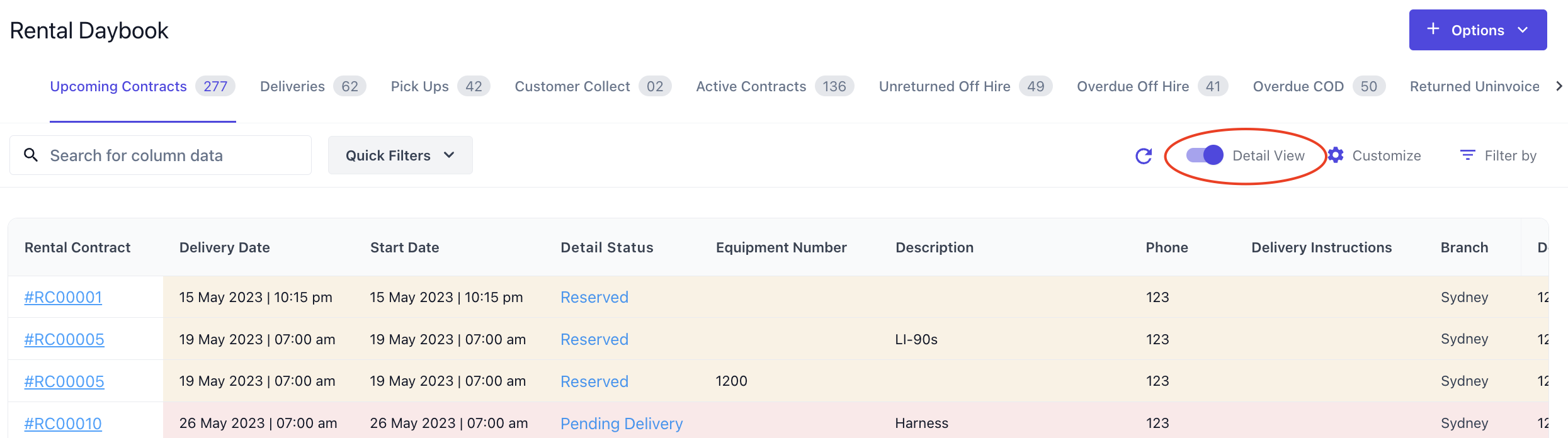 The Rental Day Book Upcoming Contracts table can now be switched between a Rental Contract or Rental Contract Detail view