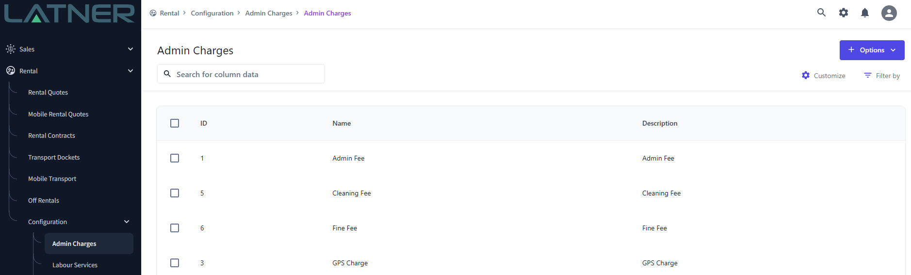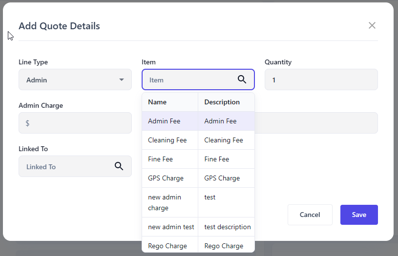The line type admin refers to the ability to add an admin related charge to a rental quote as a one time charge, such as a cleaning fee. The admin items are configurable, in the rental configuration where a user can set a name and description that will appear when adding details to a rental quote. Learn how to add admin charges in Adding admin charges to a rental quote.