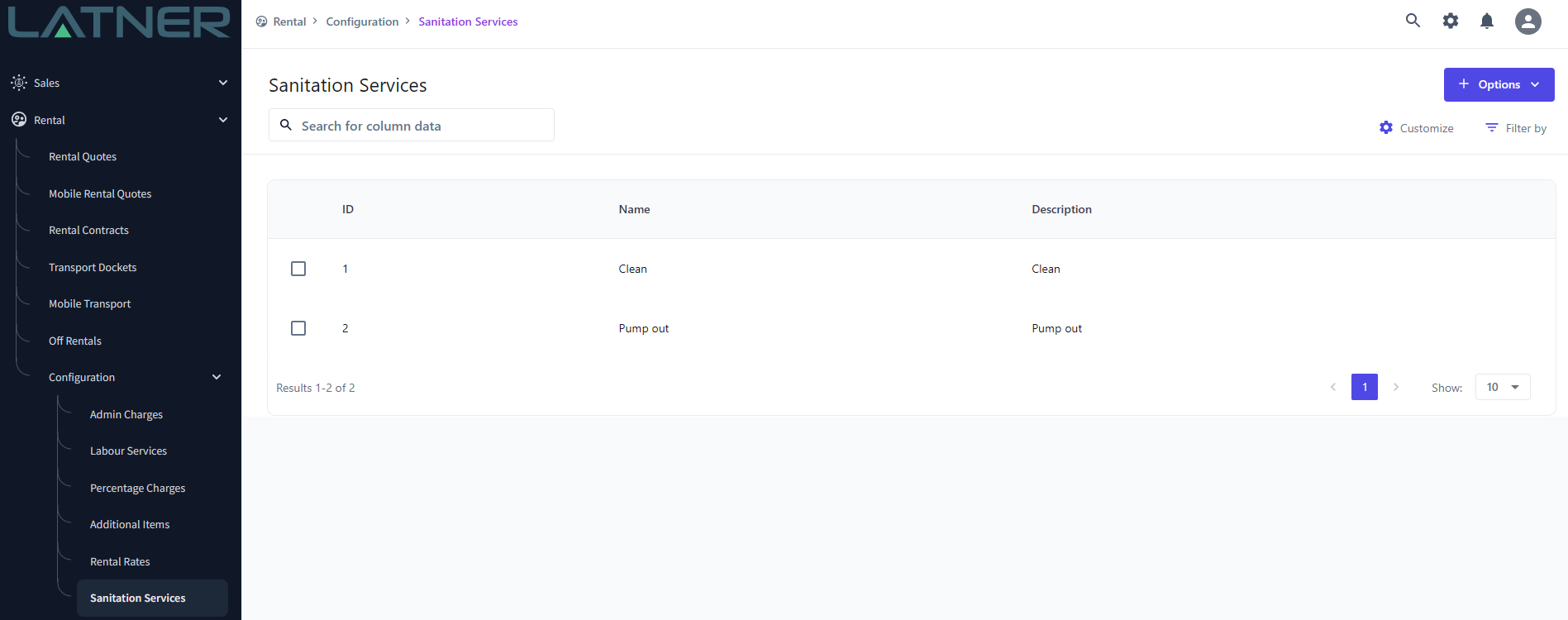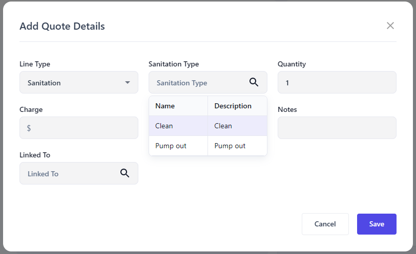 The line type sanitation refers to the ability to add an sanitation related charge to a rental quote as a recurring charge, such as a pump out clean. The sanitation items are configurable in the rental configuration where a user can set a name and description that will appear when adding details to a rental quote. Learn how to add sanitation charges in Adding sanitation services to a rental quote.