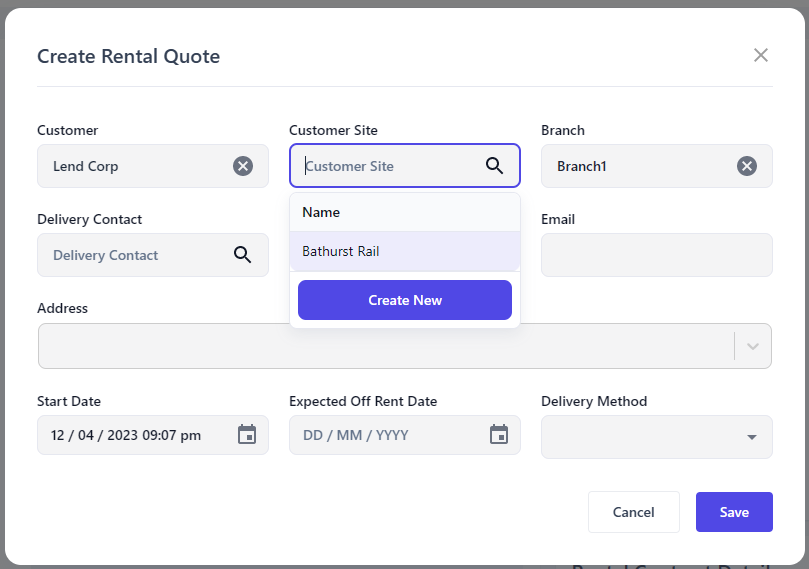 When creating a new rental quote you will need to select the customer you are quoting. When you pick this customer you might want to select the specific job site that the customer is working from. This will allow you to store things such as the delivery address, contacts, site specific rental rates and report on all equipment on a customers job site.
