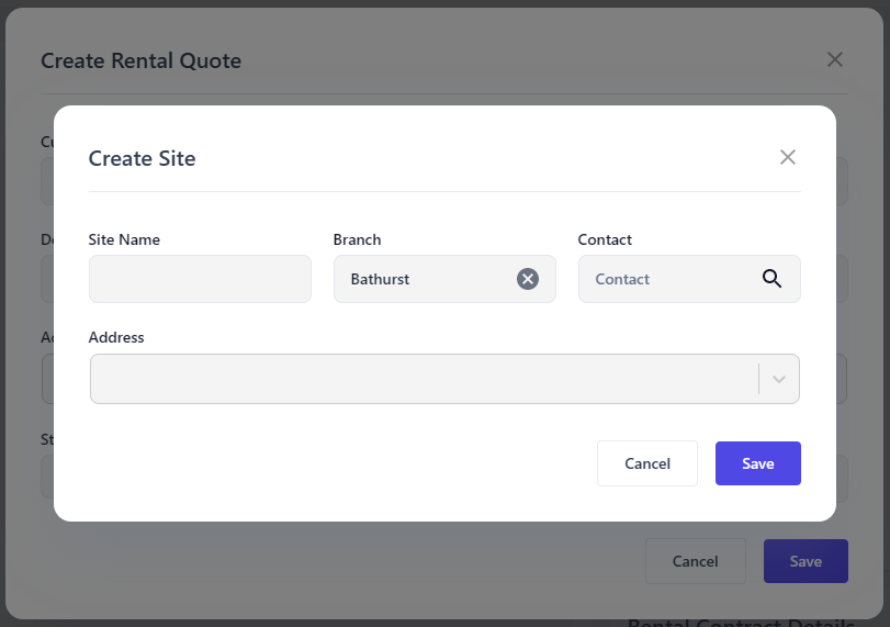 When selecting a customer site, the user can pick from an existing customer site, or create a new customer site. If you create a new site, the next time you create a rental quote and select a customer the previous sites will appear in the customer site drop down.