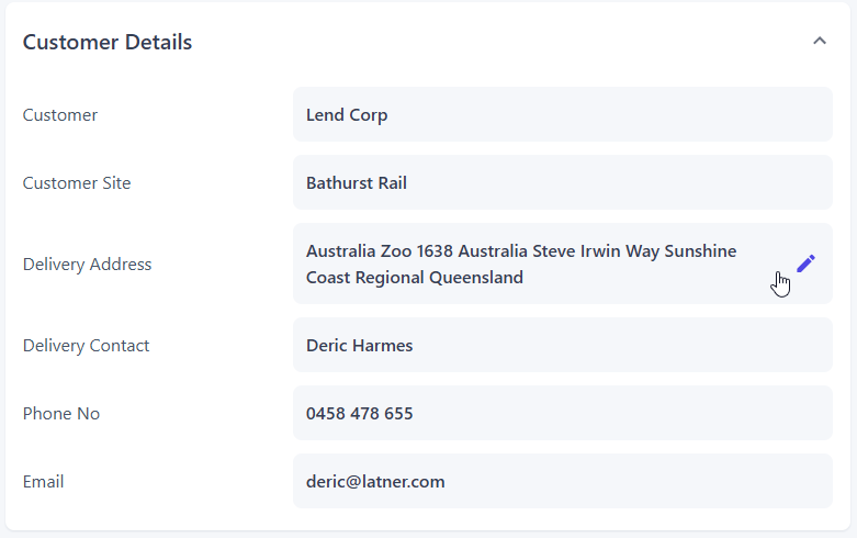 If you are want to edit the customer site address, simply hover your mouse over the delivery address field in the customer details section.