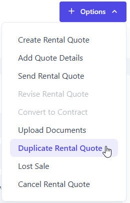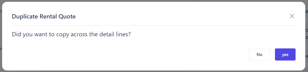 Rather than creating a new rental quote a user might want to duplicate an existing rental quote. The user will have the option to copy the header information, or the header and detail information. Be mindful that copying the detail information will copy the rental rates from the original rental quote.