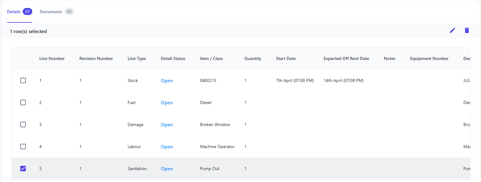 When a rental quote is created and detail lines are added, the user might want to edit or delete the detail lines. A user can select one line at a time, and a pencil and rubbish bin will appear in the top right of the detail section. Details can only edited when the header has the status of Open. If a quote has the status of Quoted and the user wants to change the details, they should create a new revision of the rental quote. Learn how to revise a quote in How to revise a rental quote.