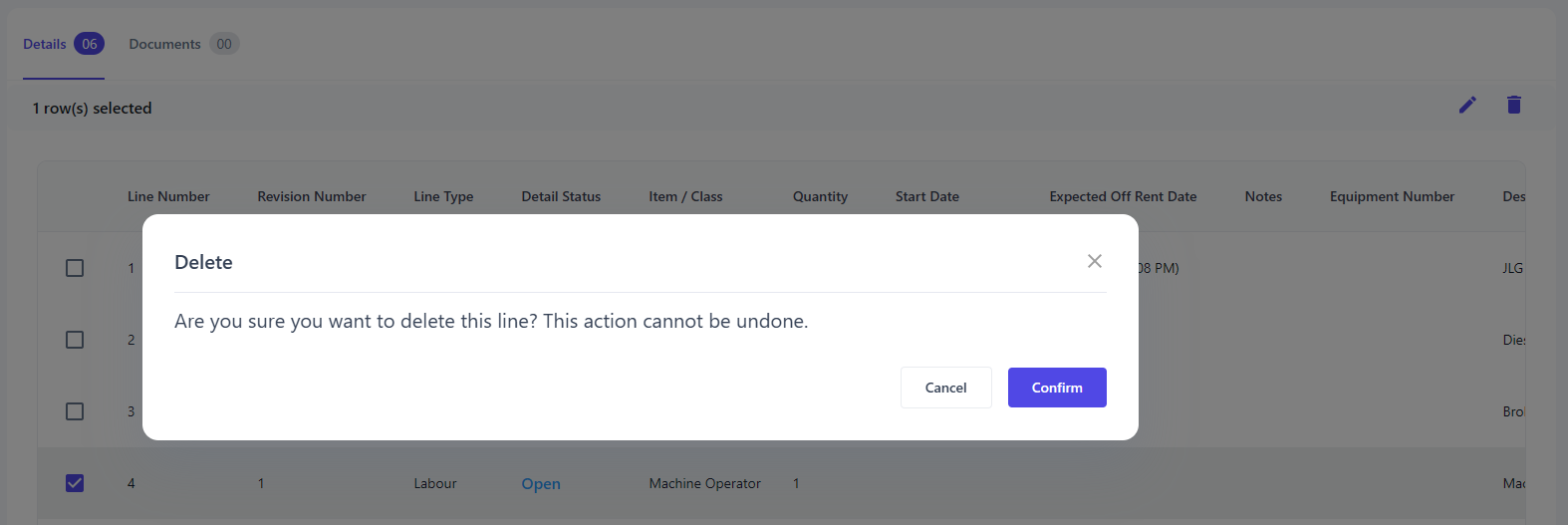 When a detail line is selected and the edit pencil in clicked, the user will have the ability to change some of the information and this will update the detail line. For equipment line types, the user can edit the detail line and select the equipment model or equipment number.