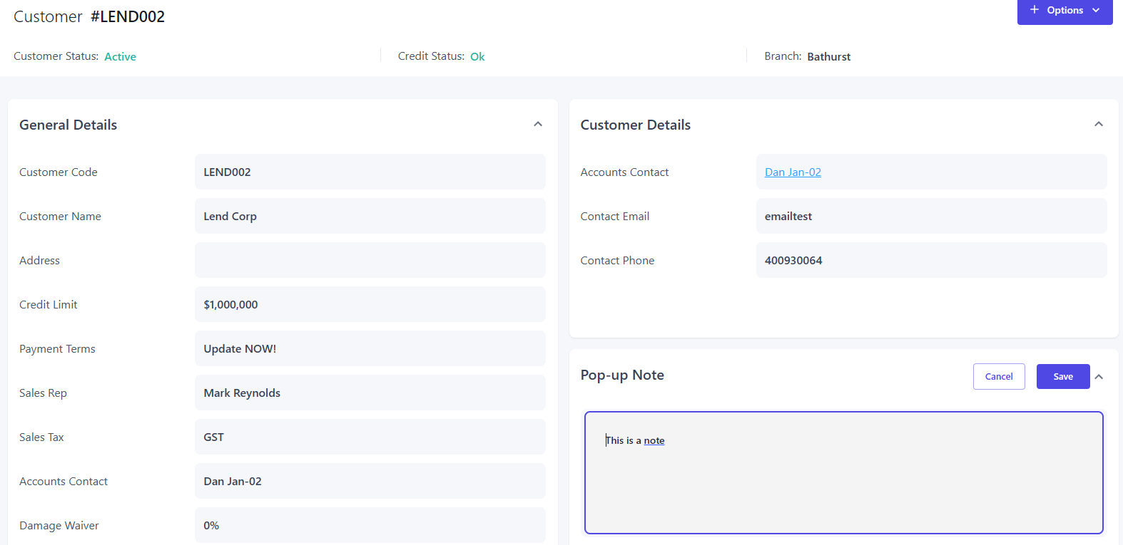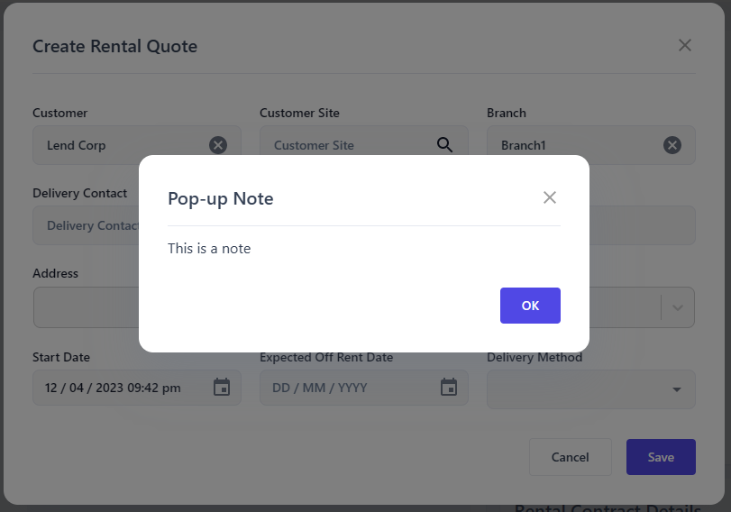 When creating a rental quote, you might want to store information that your team can view that relates to a customer. This can be displayed in a pop-up note when a customer is selected.