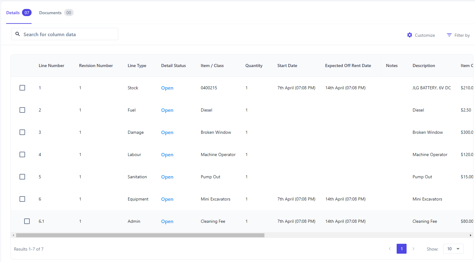 The rental quote details are always at the bottom of the rental quote screen and display the below columns:
