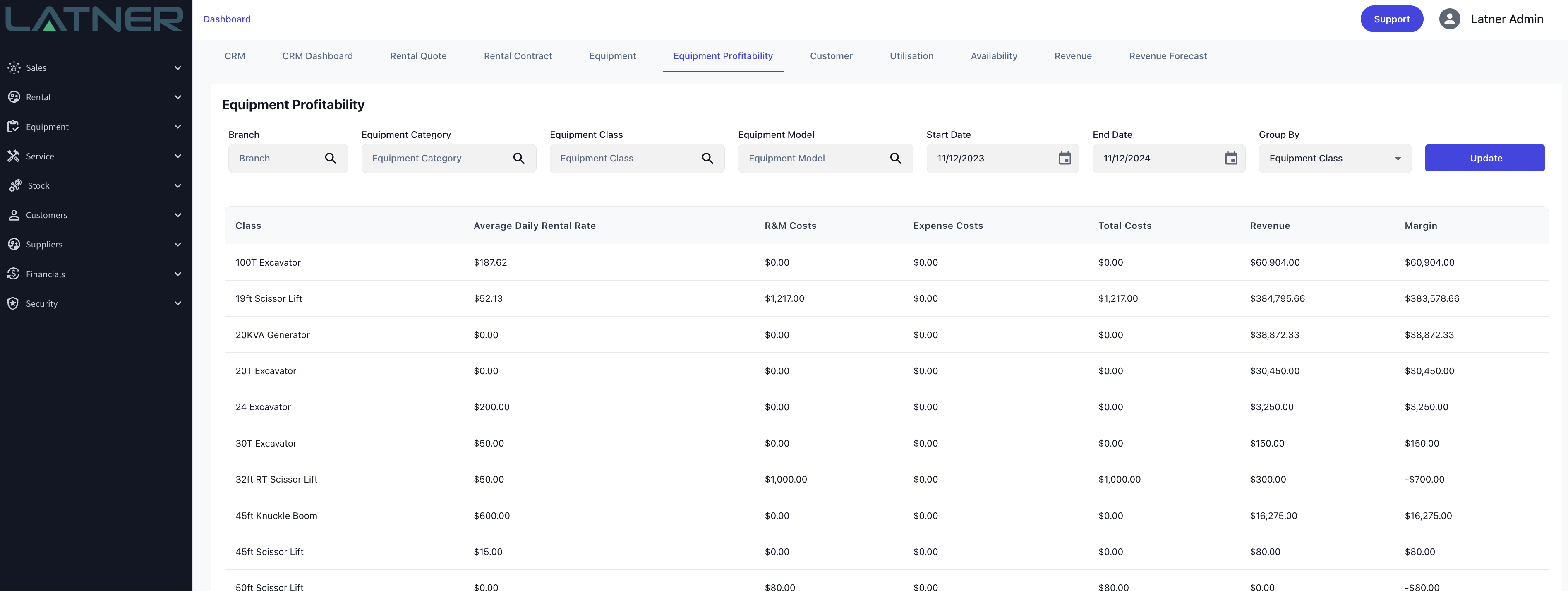 A new Dashboard has been added to Latner. Equipment Profitability lets you see the break down of Average Rental Rates, Costs and Revenue